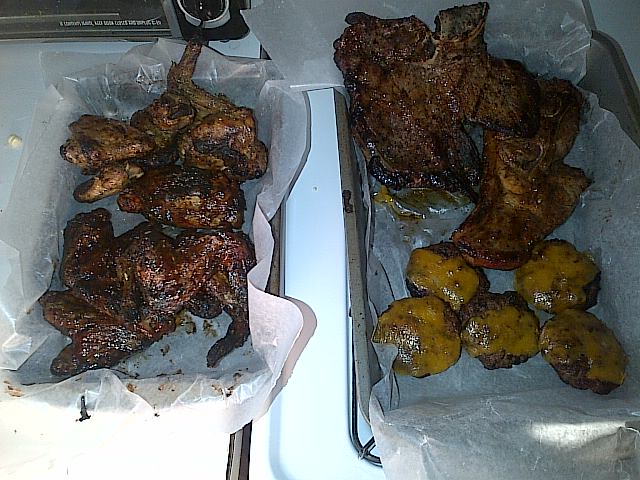 – BBQ’d chicken, steak, pork, couple of ribs my guy made, and sliders